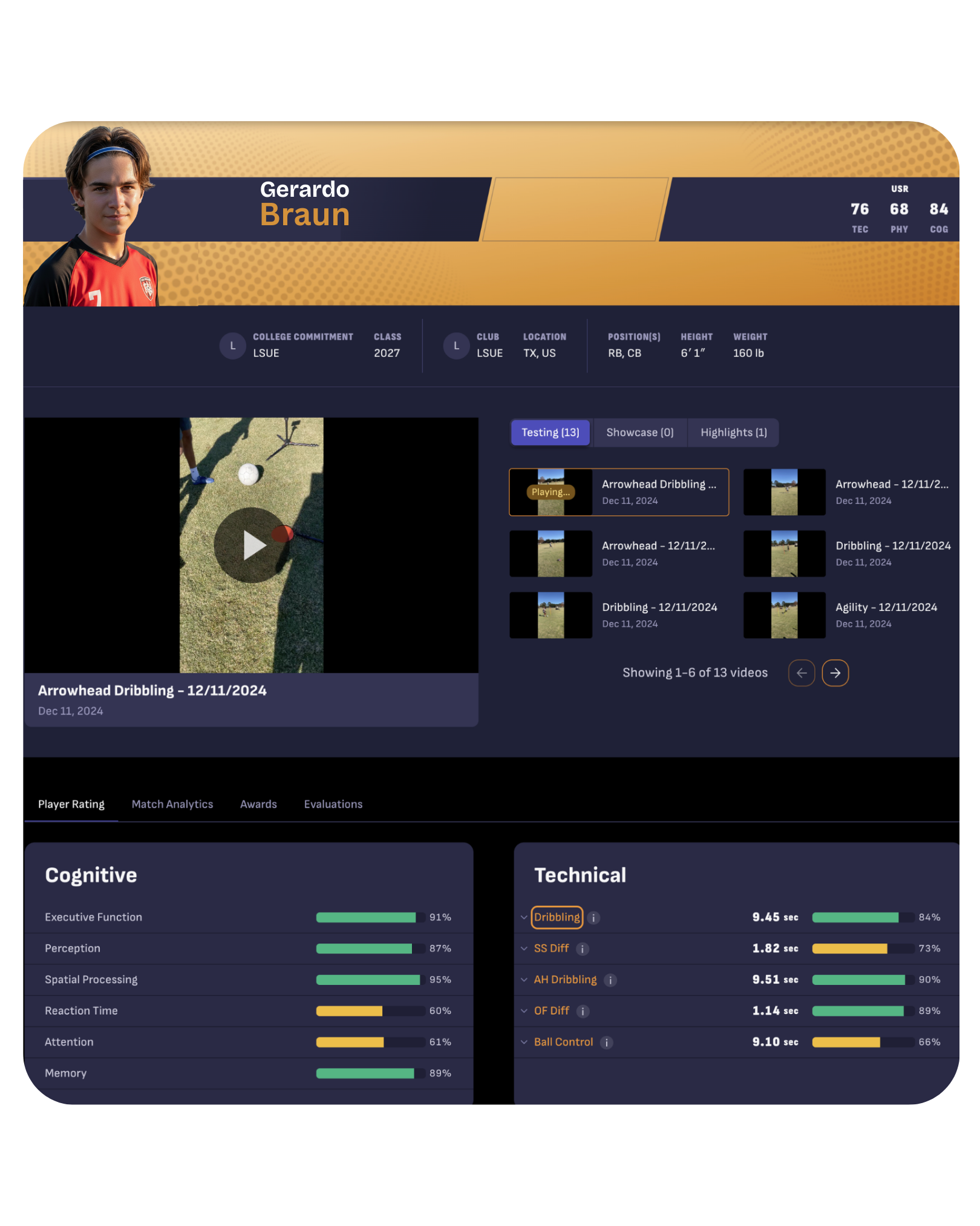 This is the player-facing and parent-facing profile that organizes everything in one place, testing results, verification video, and where the player stands in our global rankings. It includes an overall USR score and a clear snapshot of the player’s current baseline and next focus areas.