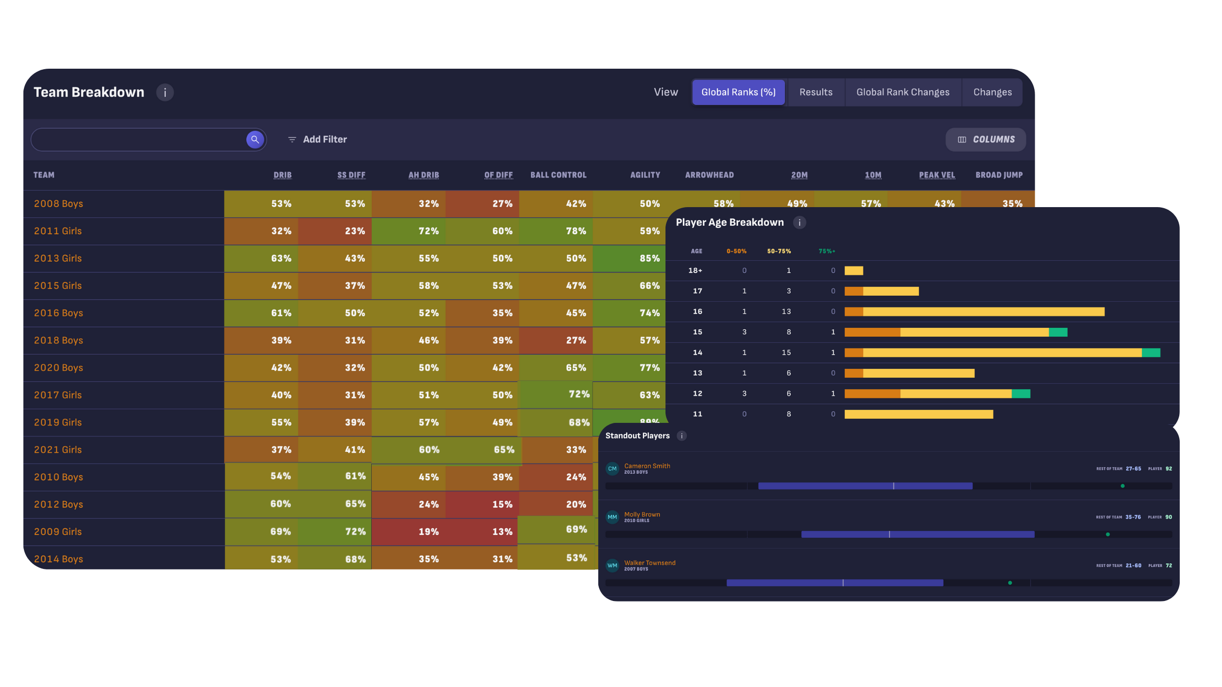 Flag outliers—players testing above their current age group/team level—so placement and development decisions are easier